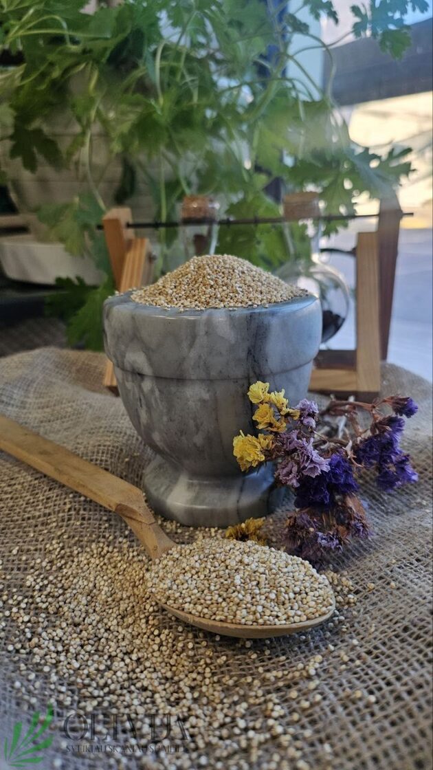 BOLIVINĖ BALANDA (Kynva) – švelnaus riešutinio skonio, traškios ypač vertingos kruopos nesukelia cukraus kiekio kraujyje šuolių sėklos. Savo skoniu ir sotumu primena grūdinę kultūrą. SAVYBĖS: visavertis baltymų šaltinis, turi daug skaidulų, mangano, magnio, vario, kalcio. Puikiai tinka veganams, BE GLITIMO. PANAUDOJIMO GALIMYBĖS: naudojamas košėms virti, kaip garnyras prie pagrindinio patiekalo, troškiniams, sriuboms, plovui ruošti. Kilmės šalis: Peru