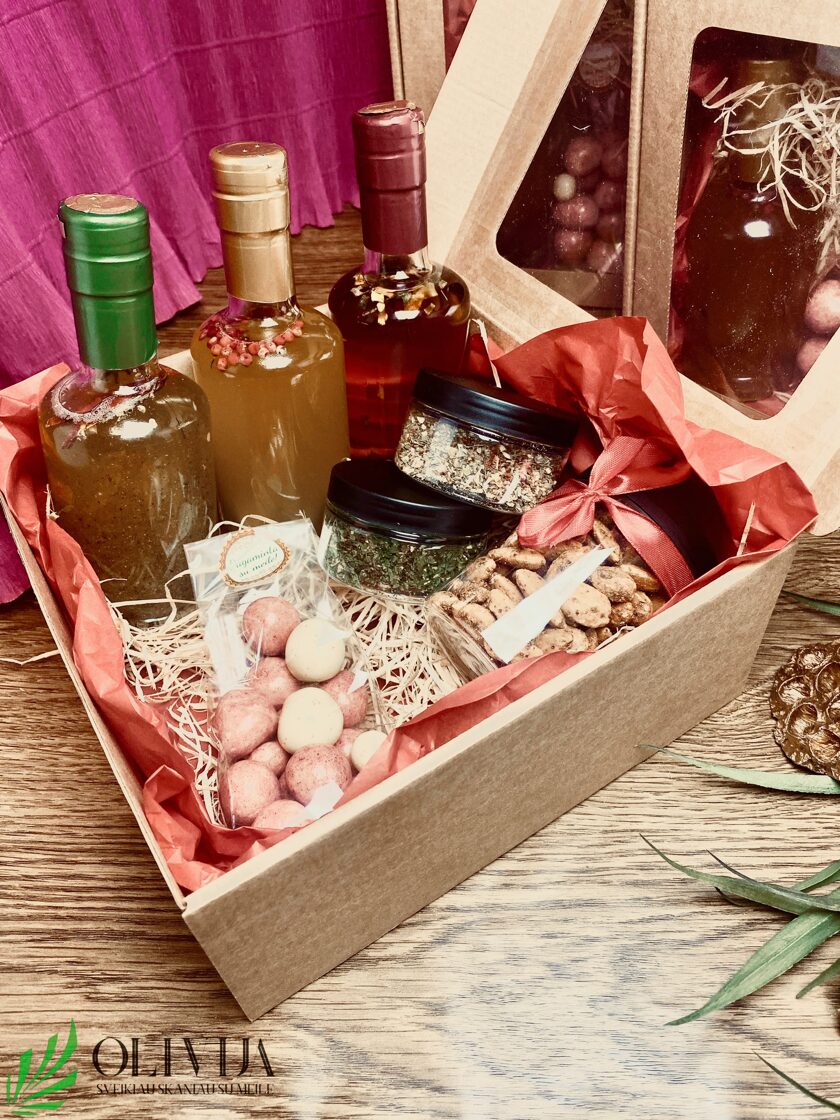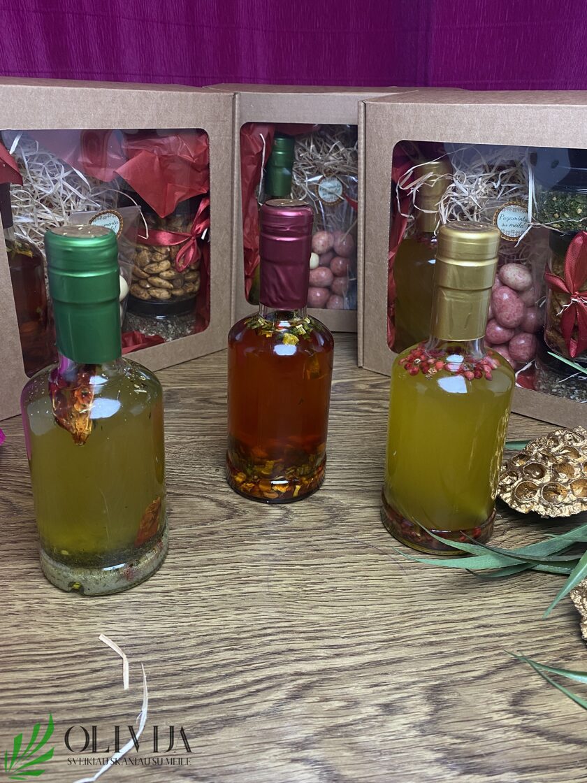 DOVANOS – puikiai tinka šeimos nariams, draugams ar k olegoms švenčių ar kitomis progoms. Mūsų kuriamos maistinės dovanos praktiškos ir įdomios, papildytos netradiciniais ingredientais, tokiais kaip įvairūs prieskonių aliejai, kakvos sviestas, ar netradiciniai prieskoniai, be abejo ir ypatingo skonio skanumynai, riešutėliai, kurie nepaliks abejingų širdžių ! DOVANA „ALIEJAUS GURMANIŠKA” SUDĖTIS: Ypatingo skonio, net trys prieskoniniai aliejukai (pasirinktinai) – 230 gr., liofilizuotos avietės su baltuoju šokoladu – 100gr., traškūs migdolai su kanape, dž.pomidoarais ir česnako prieskoniais – 170 gr., bei ypatingieji viduržemio jūros ir persilado prieskoniai – po 40 gr. Leiskite sau pasimėgauti netradiciniais, gurmaniškais skoniais ! Kilmės šalis: