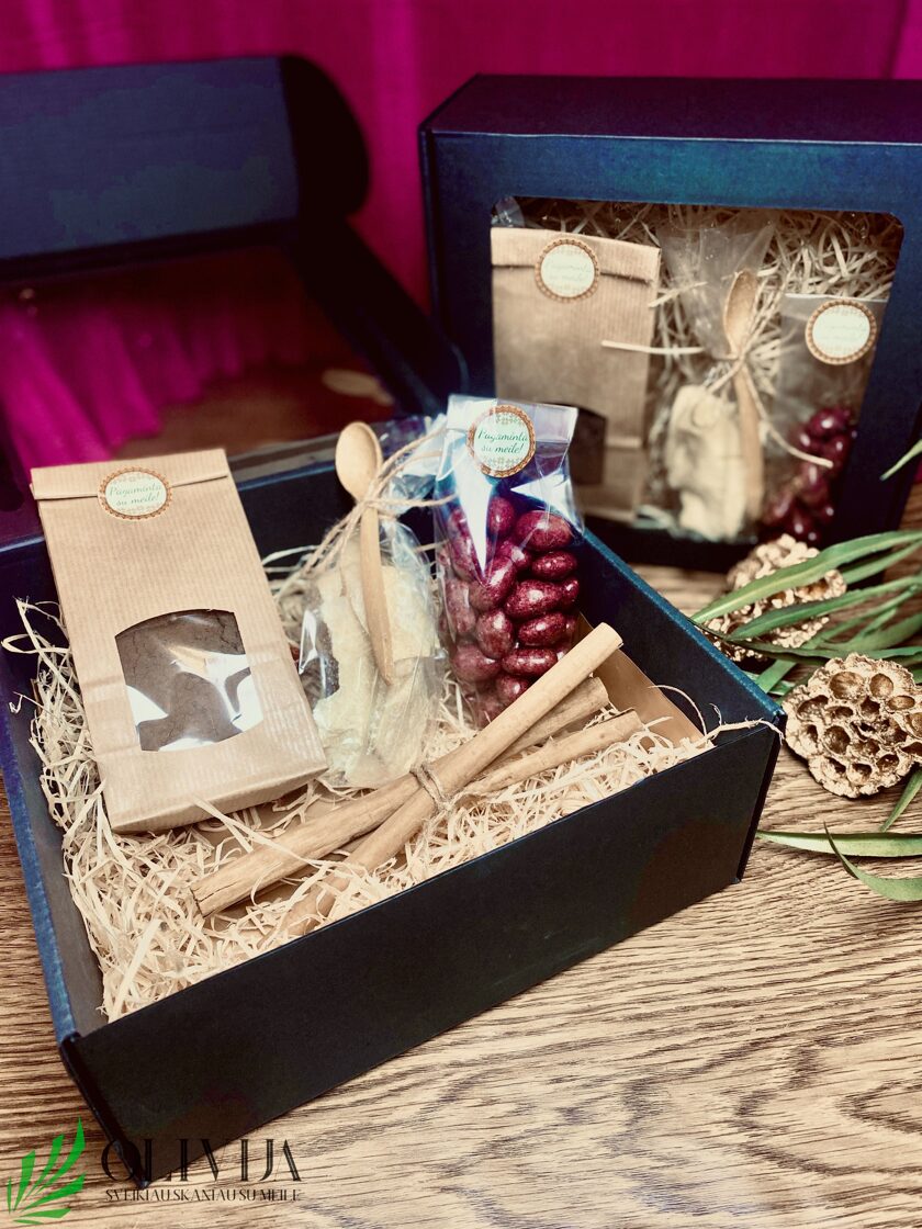 DOVANOS – puikiai tinka šeimos nariams, draugams ar kolegoms švenčių ar kitomis progoms. Mūsų kuriamos maistinės dovanos praktiškos ir įdomios, papildytos netradiciniais ingredientais, tokiais kaip įvairūs prieskonių aliejai, kakvos sviestas, ar netradiciniai prieskoniai, be abejo ir ypatingo skonio skanumynai, riešutėliai, kurie nepaliks abejingų širdžių ! DOVANA „KAVA KITAIP ” SUDĖTIS: gilių ar cikorijos šaknų kava (pasirinktinai), kakavos sviestas – 60gr., Ceilono cinamono lazdelės – 20 gr., bei traškūs migdolų riešutai glaistyti serbentų ir ruby šokoladu – 150 gr. Ieškantiems kavos alternatyvos – sveikiau, skaniau ! Kilmės šalis: