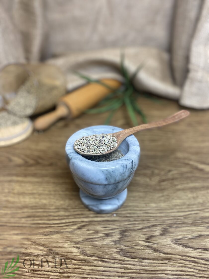 KANAPIŲ sėklos – (Cannabis sativa) yra labai maistingas ingredientas, turintis daugybę naudingų savybių naudojamas maistui ruošti ir sveikatinimuisi. SAVYBĖS: puikus augalinio baltymo šaltinis, turintis visas devynias esminess amino rūgštis, todėl jos puikiai tinka veganams ir vegetaraiems.Sėklos yra turtingos omega-3 ir omega-6 riebalų rūgštimis, kurios yra svarbios širdies sveikatai ir uždegimo mažinimui.Jos taip pat turi daug skaidulų, kurios gerina virškinimą ir padeda palaikyti sveiką žarnyno mikroflorą. Lukštentos kanapių sėklos yra turtingos vitaminų (E, B grupės) ir mineralų (magnio, fosforo, cinko), kurie prisideda prie bendros sveikatos. PANAUDOJIMO GALIMYBĖS: n audojamos salotų, sriubų, jogurto, avižinių dribsnių ar kepinių gardinimui. Jos puikiai tinka papildyti kokteilius, suteikiant kremiškumo ir maistingumo. Sėklas galima valgyti tiesiogiai kaip sveiką užkandį arba maišyti su kitomis sėklomis ir riešutais. Kanapių sėklų aliejus taip pat yra populiarus, jis gali būti naudojamas salotų padažams ir kaip priedas prie patiekalų. Kilmės šalis: