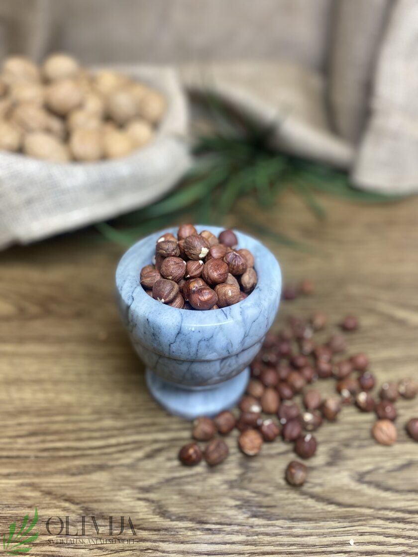 LAZDYNŲ RIEŠUTAI – su luobele, neskrudinti ir nesūdyti riešutai pasižymi šveniu skoniu, vieni skaniausių riešutų, kuriuos paskrudinus, luobelė greitai nubyra, o riešutai įgauna naują itin gerą skonį. Vertinami ne tik dėl skonio, bet ir dėl savo savybių. SAVYBĖS: gana riebūs, suteikia energijos, yra kalio, magnio, fosforo, geležies, cinko, seleno, folio rūgšties, vitaminų ir daug augalinių baltymų, taip pat aminorūgščių. Suteikia daug energijos, padeda stiprinti imunitetą, gali padėti sumažinti cholesterolio kiekį, stiprina kaulus, teigiamai veikia odą ir plaukus . PANAUDOJIMO GALIMYBĖS: vartojami kulinarijoje, salotoms, košėms, varškei, kokteiliams gardinti, užtepėlėms ir augaliniam pienui ruošti. DŽIOVINTUOSE VAISIUOSE, RIEŠUTUOESE AR UOGOSE mikroelementų koncentracija palyginti su šviežiais, yra keliskart didesnė, nes, kad gautume tiek pat mineralinių medžiagų, šviežių vaisių reikėtų suvalgyti net kelis kilogramus, todėl džiovinti, vaisiai, uogos – geras pasirinkimas norint praturtinti mitybą vitaminais. Džiovinant vaisius ir uogas išgaruoja vanduo, o visos kitos žmogui itin reikalingos medžiagos išlieka. Kilmės šalis: Gruzija