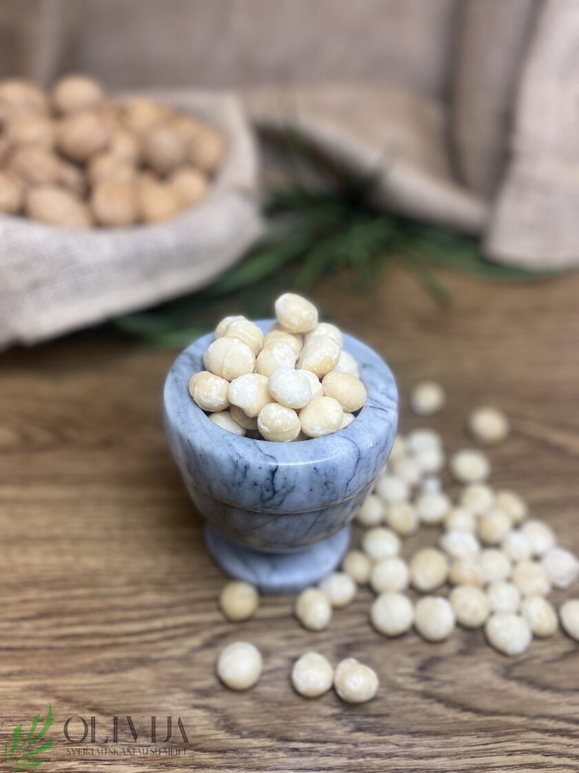 MAKADAMIJŲ RIEŠUTAI  – gliaudyti itin traškūs ir skanūs, kreminio poskonio riešutai. Pasaulyje labai vertinami ne tik dėl sunkios jų gavybos, bet ir naudingųjų savybių, laikomi „Karališku” riešutu. SAVYBĖS: vitamino E, B1, A, vario, magnio, kalcio, geležies, mangano šaltinis. Kas padeda palaikyti  imunitetą, skatina smegenų veiklą, suteikia energijos, NĖRA GLIUTENO. PANAUDOJIMO GALIMYBĖS: vartojami kulinarijoje, ledams, salotoms, košėms, varškei, kokteiliams gardinti,  užtepėlėms ir augaliniam pienui ruošti, arba vartojami vieni, kaip sveikesnis užkandis. Kilmės šalis: JAV