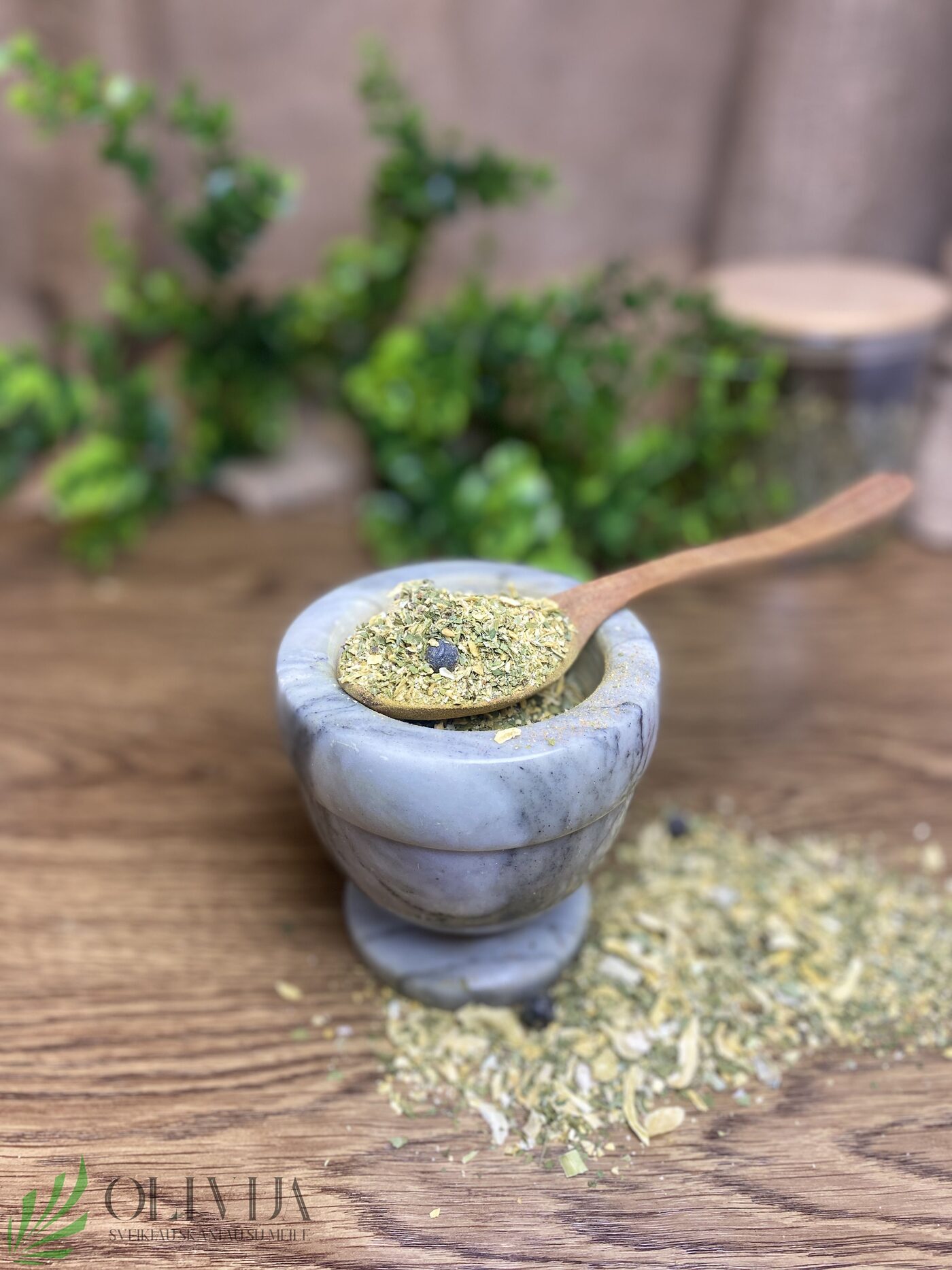 MĖSAI SU KADAGIO UOGOMIS – stambus prieskonių mišinys, puikaus egzotiško, švelnaus aromato ir skonio, kuris nepaliks abejingų ! SUDĖTIS: svogūnai, česnakai, petražolės, druska, juodieji ir žalieji pipirai, kario prieskoniai, žaliosios paprikos, kadagio uogos, porai. PANAUDOJIMO GALIMYBĖS: kpuikiai tinka tamsios ir šviesios mėsos, paukštienos marinavimui, šašlykams gardinti. Kilmės šalis: Lietuva Kiekis : 70 g.