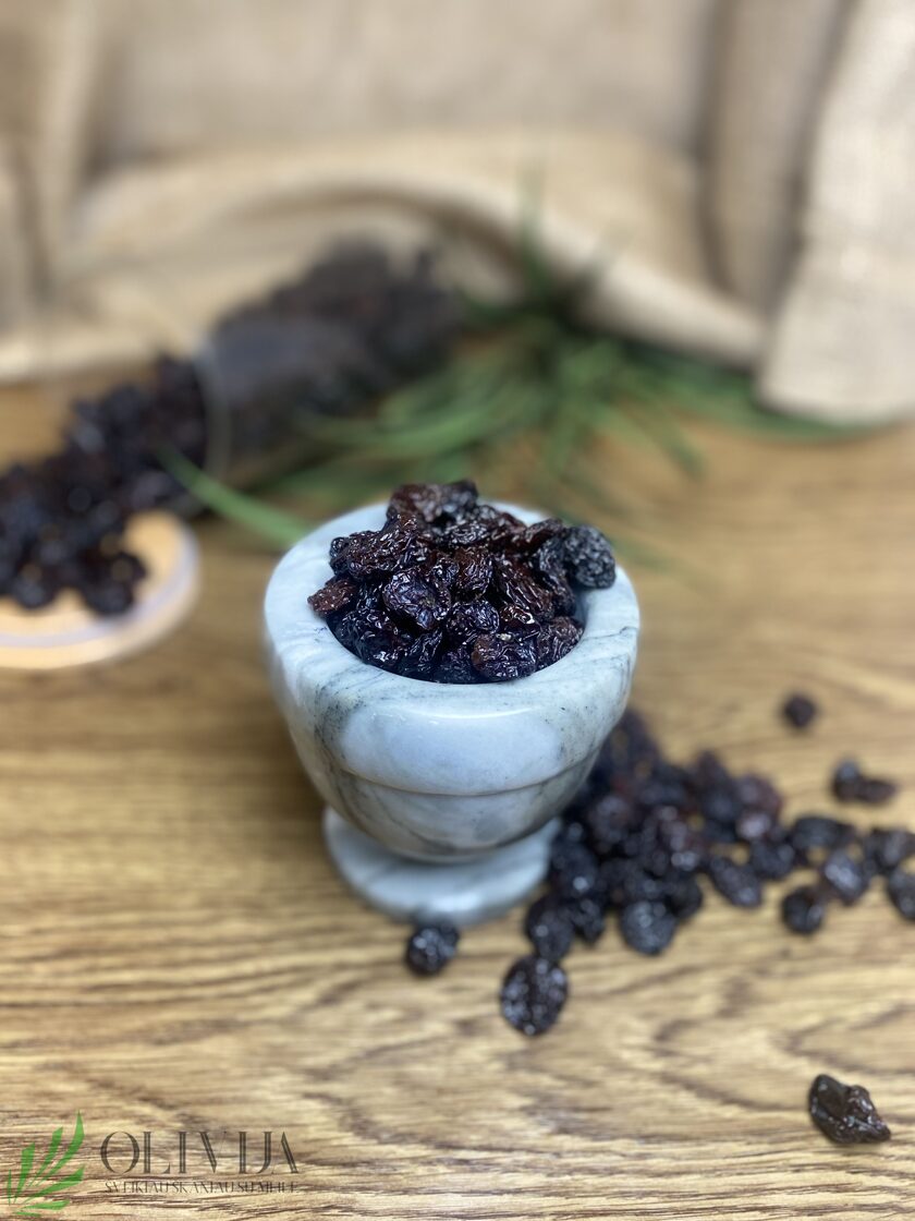 RAZINOS „JUMBO” – džiovinta tamsi vynuogių rūšis, be sėklų, natūraliai saldaus skonio, didelės. SAVYBĖS: yra A ir C, B grupės vitaminų, kalio, kalcio, geležies, cinko, fosforo, jodo, seleno ir daug antioksidantų, palankiai veikia širdį, virškinimą. PANAUDOJIMO GALIMYBĖS: puikiai dera kulinarijoje, kisieliams virti, košėms, salotoms, užpiltinėms, girai, ryžiams gardinti, plačiai naudojamos ir vienos, kaip sveikesnis užkandis, DŽIOVINTUOSE VAISIUOSE mikroelementų koncentracija palyginti su šviežiais, yra keliskart didesnė, nes, kad gautume tiek pat mineralinių medžiagų, šviežių vaisių reikėtų suvalgyti net kelis kilogramus, todėl džiovinti, vaisiai, uogos – geras pasirinkimas norint praturtinti mitybą vitaminais. Džiovinant vaisius ir uogas išgaruoja vanduo, o visos kitos žmogui itin reikalingos medžiagos išlieka. Kilmės šalis: Čilė