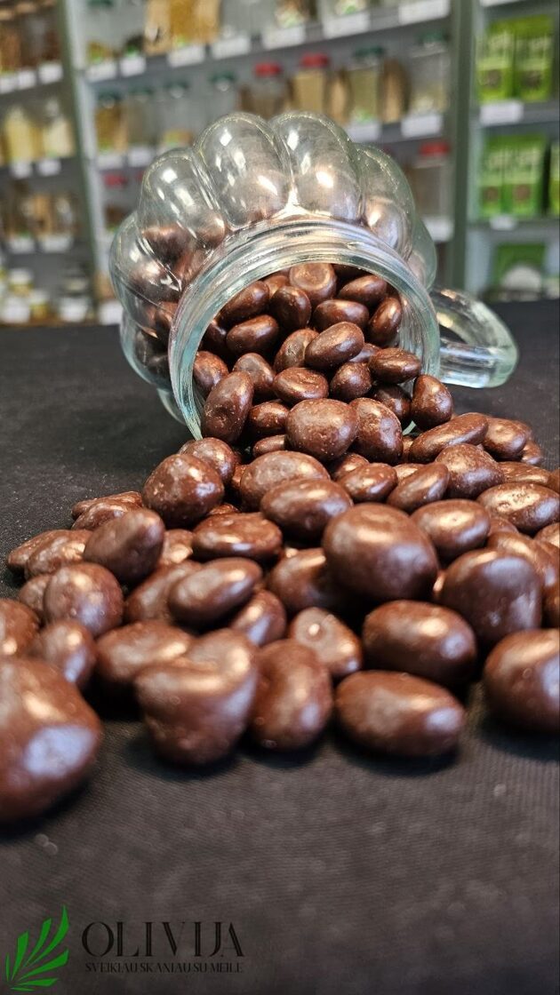 SPANGUOLĖS JUODAME šokolade  –  rūgštoko skonio spanguolių uogos, kuriose gausu vitaminų, mineralų ir mikroelementų  aplietos juoduoju šokoladu, kuriame  kakavos sausųjų medžiagų – 50 %. SUDĖTIS:   šokoladas 50 % (cukrus, kakavos masė, kakavos sviestas, emulsiklis SOJŲ lecitinas, kvapioji medžiaga vanilinas), cukruotos spanguolės 49 % (spanguolės (51 %), cukrus, saulėgrąžų aliejus), glajinės medžiagos (tapijokų krakmolas, šelakas). DAUG SKAIDULINIŲ MEDŽIAGŲ. Šokolade kakavos sausųjų medžiagų – ne mažiau kaip 50 %. Gali būti GLITIMO , PIENO , ŽEMĖS RIEŠUTŲ ir kitų RIEŠUTŲ pėdsakų. Kiekis:150 gr. Kilmės šalis:  Šokolado kilmė: ES ir ne ES.