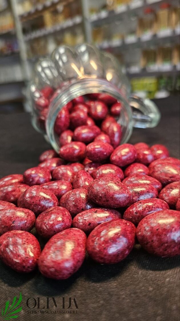 TRAŠKUS MIGDOLAS SERBENTŲ GLAISTE  –   išraiškingo skonio traškūs  migdolai, padengti Ruby šokoladu ir juodaisiais, šaltyje džiovintais, serbentais nepaliks abejingų. SUDĖTIS:   –   ruby šokoladas 62% (cukrus, kakavos sviestas, nenugriebto PIENO milteliai, kakavos masė, emulsiklis SOJŲ lecitinas, rūgštis citrinų rūgštis, natūrali vanilės kvapioji medžiaga), MIGDOLAI 25%, cukrus, liofilizuoti juodieji serbentai 1,5%, glajinės medžiagos (tapijokų krakmolas, šelakas). Ruby šokolade kakavos sausųjų medžiagų – ne mažiau kaip 41,8 % .  Gali būti GLITIMO , ŽEMĖS ir kitų RIEŠUTŲ pėdsakų Kiekis:160 gr. Kilmės šalis: Lietuva
